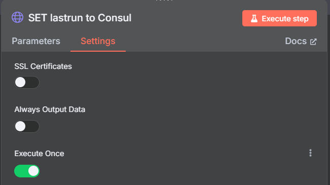 Dans le cas où le workflow se retrouve à traiter plusieurs items, on souhaitera que la mise à jour dans Consul ne s’exécute qu’une seule fois. Ca se fait dans l’onglet Settings en cochant “Execute once”