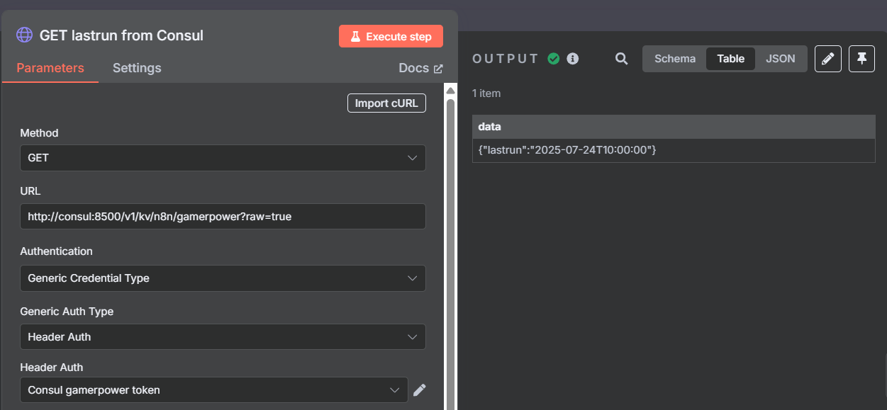 Pour récupérer les variables, qui sont stockées sous la forme d’un objet JSON, on fait un appel HTTP à http://consul:8500/v1/kv/n8n/gamerpower?raw=true
