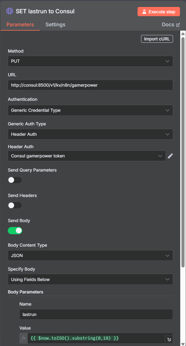 Pour sauvegarder son état dans Consul, c’est la même chose que pour la récupération, mais avec un PUT : http://consul:8500/v1/kv/n8n/gamerpower