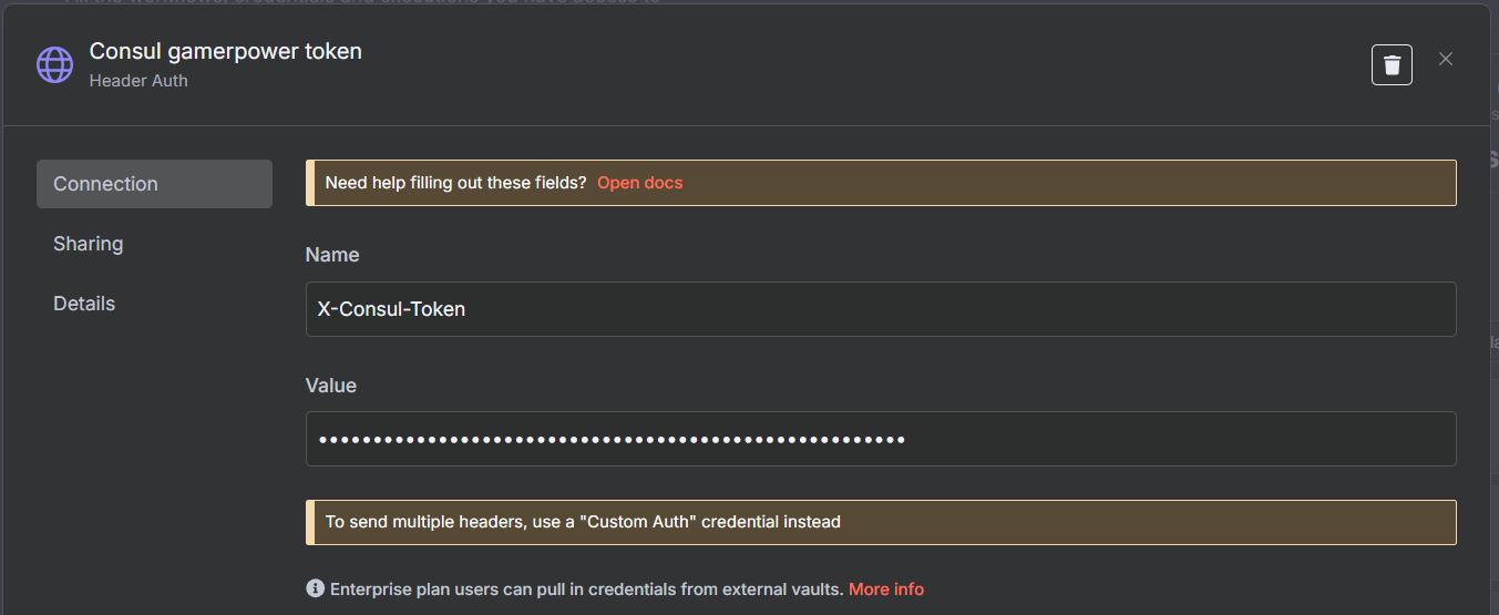 Il restera ensuite à créer un credential dans n8n, de type Header Auth pour faire passer l’en-tête HTTP X-Consul-Token qui contiendra le token d’accès.