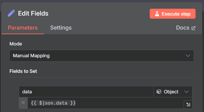 Le JSON récupérée étant vu par n8n comme un bête string, on va lui coller directement derrière une opération pour parser l’objet. Ca se fait avec un nœud de type “Edit field”.